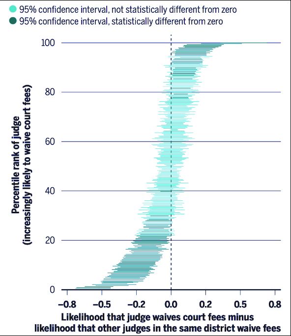 A figure depicting the likelihood that a judge waives court fees minus the likelihood that other judges in the same district waives fees. The line on the graph indicates that there’s a significant difference in judge behavior, even in the same district.